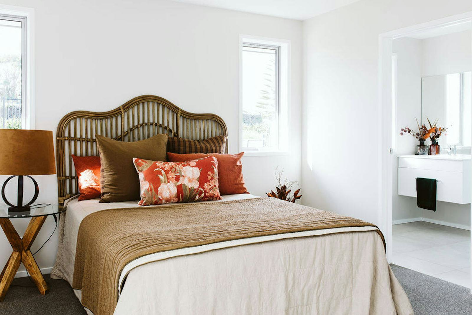 “We wanted a laundry with an external entry, which is very handy for an outdoor dirt-loving pre-schooler to strip off without traipsing dirt through the house,” says Sam. This led them to forgo a fifth bedroom and the space works as a laundry and walk-in pantry from the kitchen side. “This proved to be a really good decision and one of the reasons we chose our particular house plan,” says Sam. The couple upgraded the bathroom fixtures and fittings to create a modern spa feel with wet rooms and floor-to-ceiling tiles for walk-in showers.