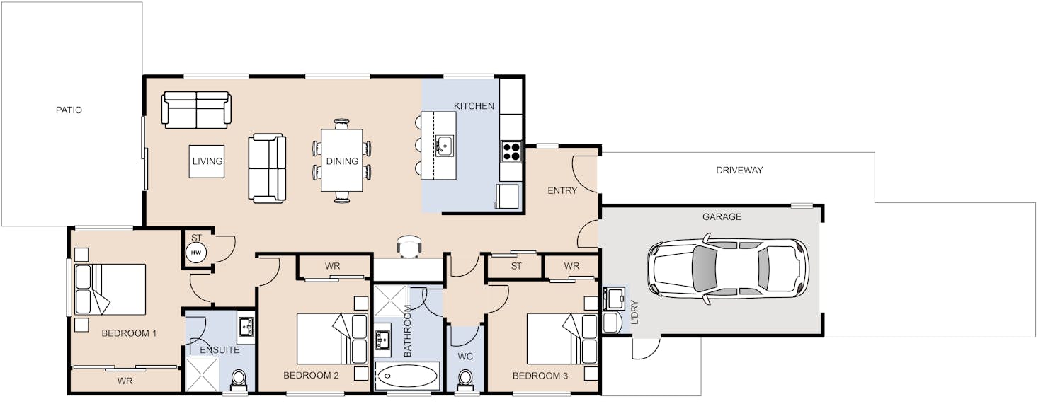 This modern three-bedroom home features light and airy open plan living spaces and three double bedrooms, including a master with ensuite and spacious wardrobe. The clever floorplan was designed with affordability in mind without compromising on quality.