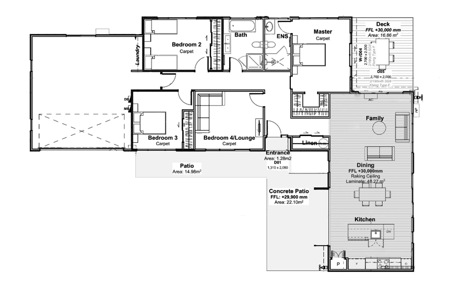- Open plan main living area kitchen dining family room with raking ceilings to open up the area that sprawls onto a deck via both family room and Master