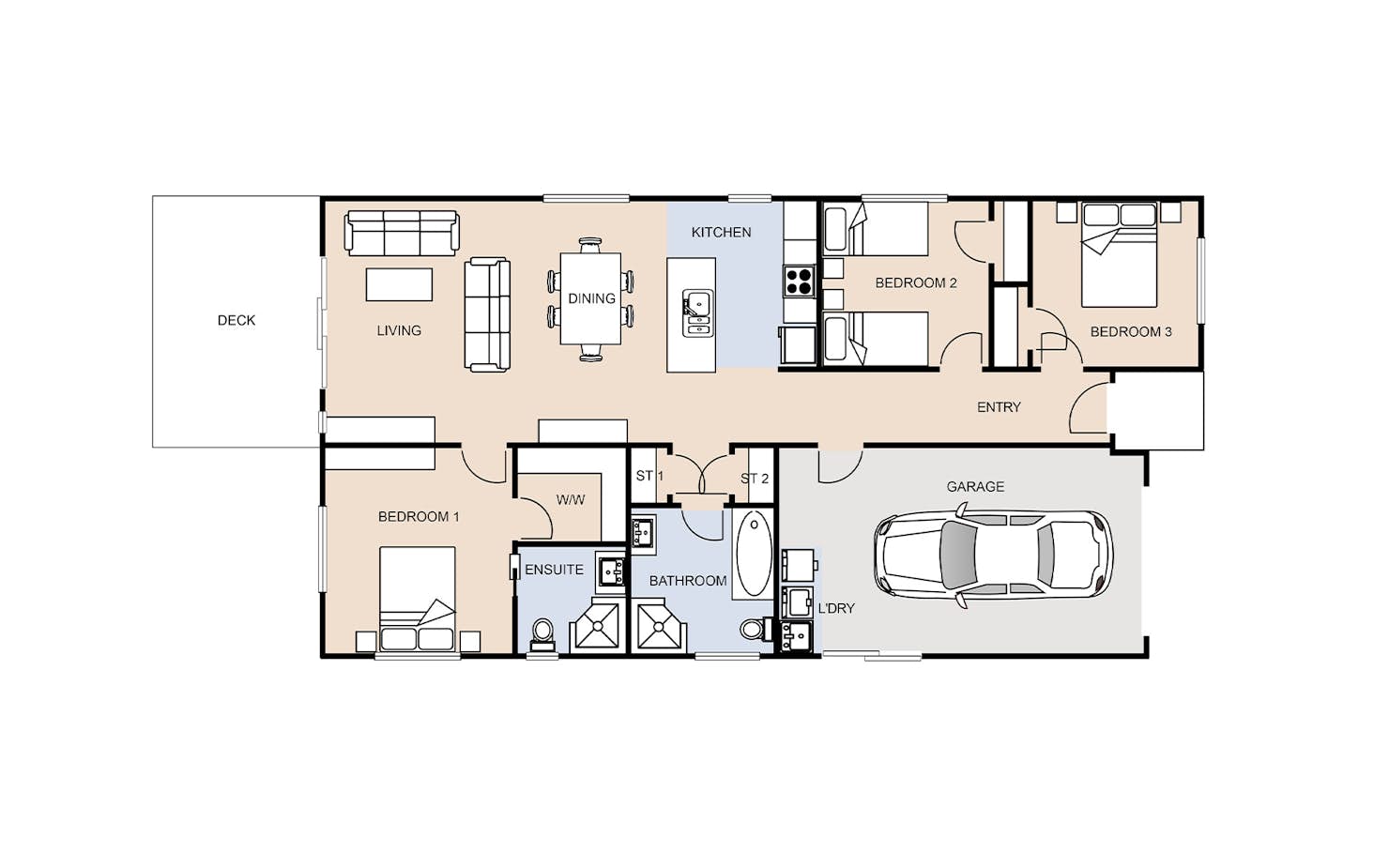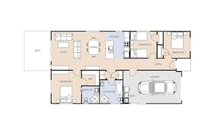 The Rimu house plan is ideal for families, the perfect fusion of style and functionality. Providing three generously sized bedrooms, the master bedroom features a large walk-in robe and ensuite. The open kitchen, living and dining space allow for an abundance of natural light with easy access to the outdoors.