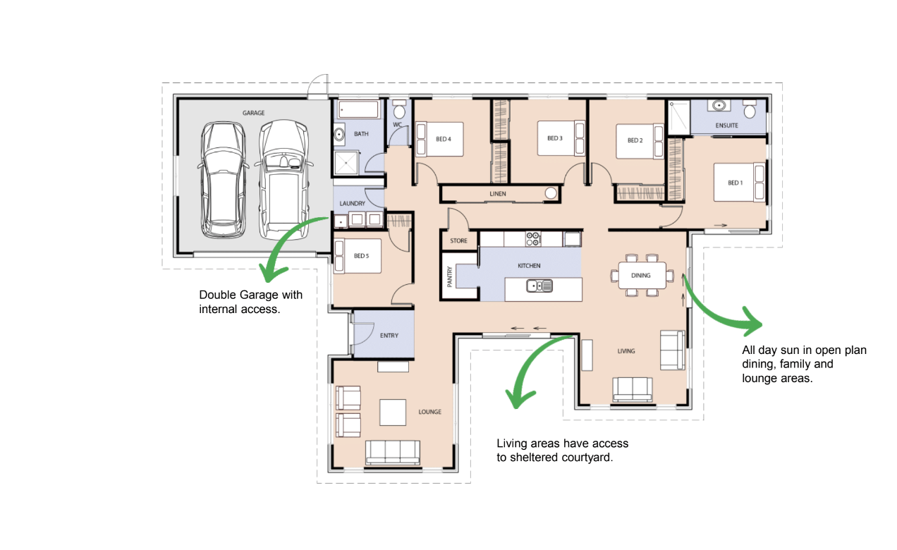 Signature Homes Tangaroa house plan is the ideal design for the NZ lifestyle. Open spaces connect in the centre of the home with a designer kitchen which faces the outdoors.